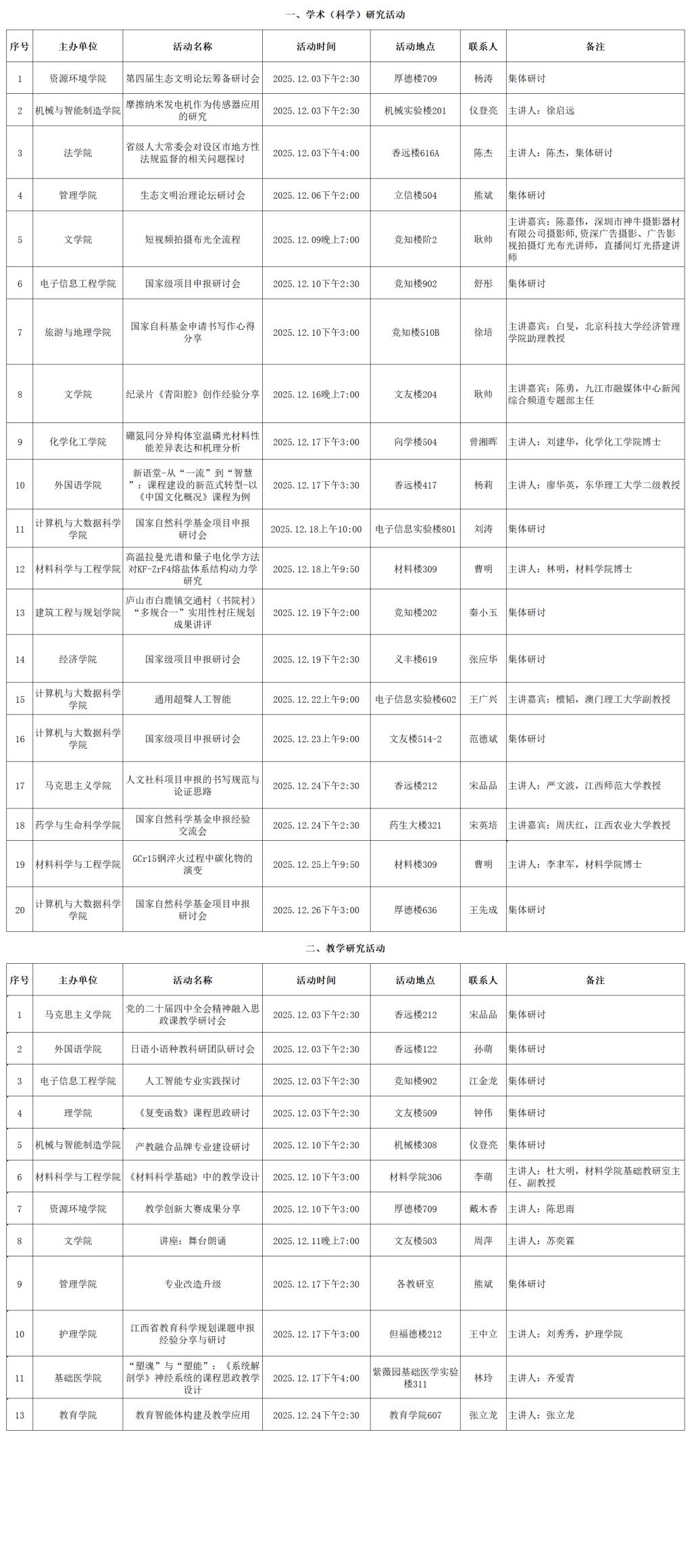 九江学院2025年12月学术(科学)研究、教学研究活动预告