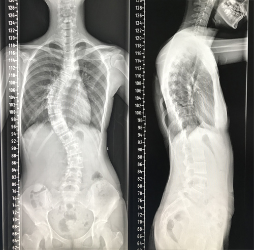 患者小冰今年13岁,4个月前家属发现小冰肩背部明显不对称,严重影响美观,且无法平卧入睡,经多方咨询,慕名来临床医学院/附属医院骨三科就诊。专科检查发现患者脊柱呈明显S型弯曲,躯干向右侧倾斜,双肩不等高,剃刀背畸形,主胸弯Cobb角度达60°,脊柱畸形较为严重。该院骨三科朱述浪主任带领脊柱外科团队,详细讨论了小冰的病情。