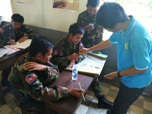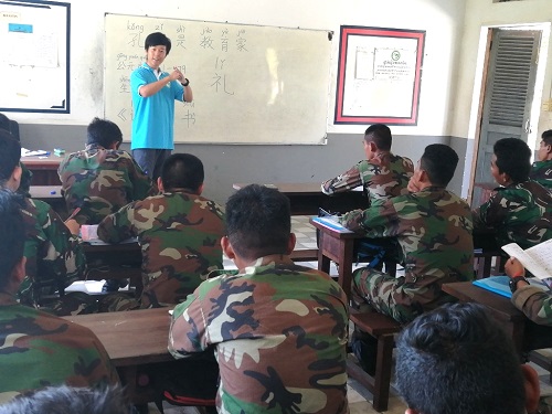 10月12日下午,为庆祝第五个全球“孔子学院日”,柬埔寨皇家科学院孔子学院911旅特种伞兵部队汉语中心举办了以“体验文武之道”为主题的文化活动。此次活动分为“文”“武”两部分。“文”的部分包括认识孔子、解读孔子思想、软笔书法体验和白板签名等活动;“武”的部分则包括体验作揖礼、抱拳礼和少林五步拳等。本次活动由911旅特种伞兵部队汉语中心志愿者教师崔晨晨组织,二十余名学生参与。
