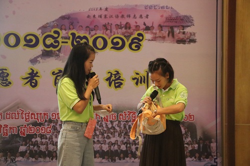 22日上午,柬埔寨皇家科学院秘书长杨博(YANG Peou)博士、中华人民共和国驻柬埔寨王国大使馆政治处主任王德鑫先生、中国孔子学院总部/国家汉办项目官员来永梅女士、柬埔寨柬华理事总会常务副会长兼文教师资基金处处长郑棉发勋爵、柬埔寨皇家科学院孔子学院柬方院长苏碧娜女士(VUTH Sopheakna)等领导莅临开幕式现场并致辞。随后,禹志云教授首先向志愿者们介绍了课堂游戏教学法,强调了对外汉语课堂上游戏对于学生的角色认同与移情体验的重要性,并分类介绍了“传音壁”“生词接龙”等切实有效的教学游戏。林秀琴副教授则向大家讲解了如何设计以学生为中心的教学活动,林老师说,“课堂应是活动的、交际的、创造的课堂,教师要用活动引燃你的课堂,让学生多多参与进来。”两位专家的讲课对志愿者老师们的启发很大。下午,志愿者们分别按照“风景名胜组”/“高棉精灵组”分组互动,分享彼此的教学游戏法。短短一个下午,每位志愿者教师就学习到了30个教学游戏,收获满满。
