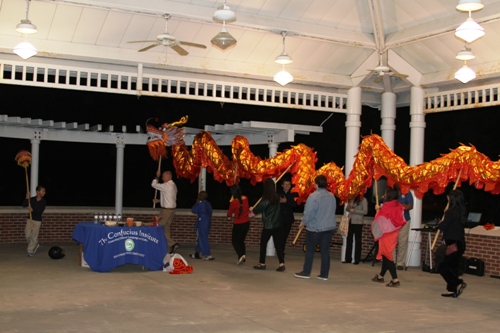 中午时分,萨凡纳州立大学活动中心张灯结彩,宾客们身着节日的盛装,踏着民乐《喜洋洋》的欢快节奏步入大厅。在喜庆的锣鼓声中,一条金色巨龙高昂着头,威武地跃进大厅,拉开了演出的序幕。身着节日红妆的学生们边唱边跳《恭喜你》,欢快明悦,青春洋溢,还用标准的汉语带着全场观众齐声高呼“万事如意”“新年快乐”“大吉大利”;舞蹈《落花》向观众展现了中国江南的婉约与柔美;最动人的是师生合唱《龙的传人》,上至七十岁下至七岁的学员们,在悠扬的葫芦丝伴奏下,认真吐词发音,感染了在坐观众,赢得阵阵掌声。