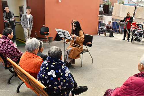3月31日,艺术学院“文艺轻骑兵”第一站是在浔阳区第三老年公寓。老人们在听说“文艺轻骑兵”要来后都非常开心并表示欢迎。有些老人更是自己就走出来了房间,坐到了志愿者们准备好的长椅上,在老人们的掌声中节目正式开始。开场的是一首民谣歌曲之后依次是民乐琵琶和二胡,语言类节目小品过后就是美丽的舞蹈表演。看着队员们的表演,有些老人想起了自己年轻时的神采,也拿起话筒为大家表演自己的绝活,有些老人跟着志愿者们一起唱唱跳跳,好是快乐,也有些老人看着队员们,想起了自己的孩子,情不自禁,潸然泪下。