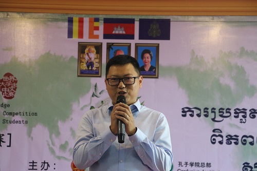 柴克清院长代表柬埔寨皇家科学院孔子学院对到场师生表示热烈欢迎,并对中国驻柬埔寨大使馆、“汉语桥”预赛协办方柬埔寨福建总商会和太子地产慈善基金、参赛高校的大力支持表示感谢。柴院长表示,第十八届“汉语桥”比赛以“天下一家”为主题,该主题充分体现了由中国举办的“一带一路”国际合作高峰论坛所提的“人类命运共同体”这一主流意识。中柬两国已成为全面战略合作伙伴关系,柬埔寨皇家科学院孔子学院从语言文化交流的角度为中柬两国之间搭建起了命运共同体的沟通桥梁,促进两国民心相通。语言相通是民心相通的基础,本次“汉语桥”比赛为柬埔寨中文学习者和爱好者提供了一个展示自我和交流学习的平台。柴院长还为选手们接下来的比赛鼓劲加油,“同学们能勇敢地站在这个舞台上就已经成功了一半,希望各位选手积极表现,勇创佳绩!”