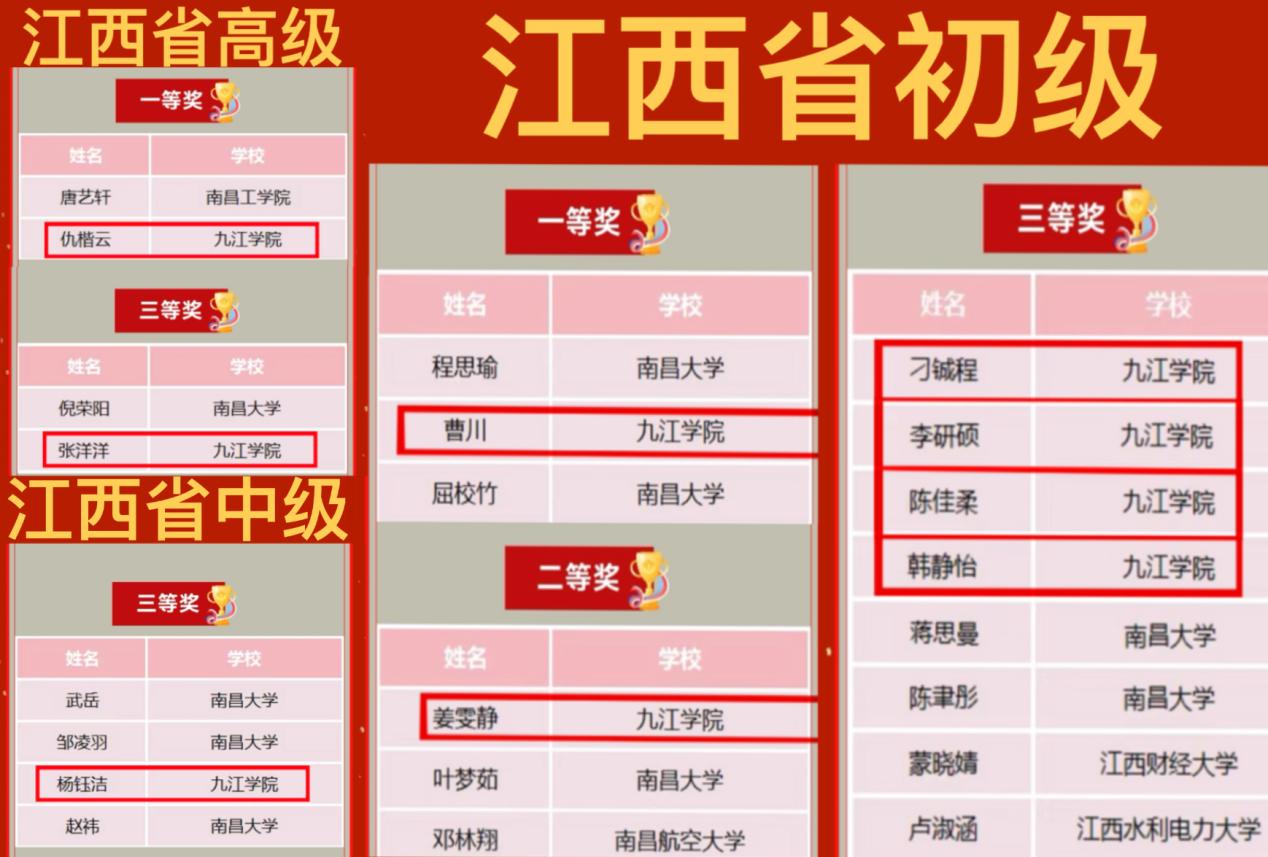 在全国赛中,仇楷云(外国语学院)获高级组二等奖;曹川(文学院)获初级组二等奖;姜雯静(外国语学院)获初级组三等奖。在江西省赛中,仇楷云再获高级组一等奖,张洋洋获高级组三等奖,杨钰洁获中级组三等奖;曹川、姜雯静、刁铖程、李研硕、陈佳柔、韩静怡等分获初级组一、二、三等奖。